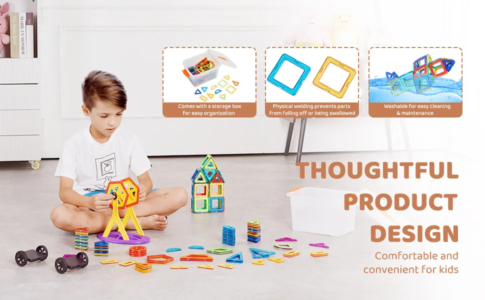 Featuring a premium plastic storage box, this kids magnetic tiles set makes clean-up and storage a breeze. The one-piece design prevents pieces from falling out, and it's washable, making maintenance easy for busy parents.