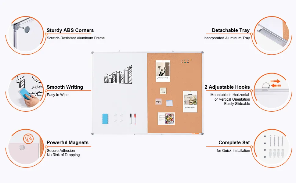 • Smooth Writing and Easy Erasing: Our magnetic whiteboard has a smooth, scratch-resistant surface that works well with dry-erase markers, making writing and erasing easy. The cork area is upgraded with 7 layers of corrugated paper and a galvanized sheet, preventing bulging and keeping items securely pinned. The included dry-erase marker wipes off cleanly, and the bottom tray keeps your markers and erasers handy, saving time.