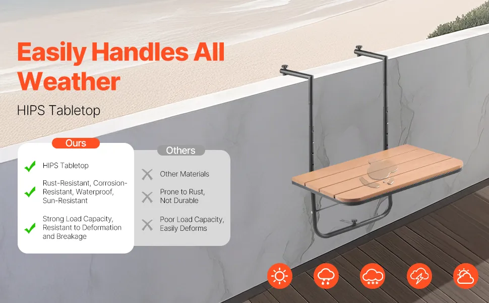 Durable & Rust-Resistant: Crafted with a high-quality HIPS tabletop, premium paint coating, and stainless steel brackets, this balcony railing table is designed to resist rust and corrosion. Built to withstand various weather conditions, it ensures reliable, long-lasting performance for outdoor use.