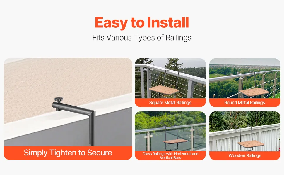 Highly Versatile and Easy to Install: With an adjustable bracket width ranging from 1 to 8.27 inches, this table fits various types of railings, including square, round, tile, and wood. No measuring or professional installation is needed – you can easily set it up yourself, even without prior experience.