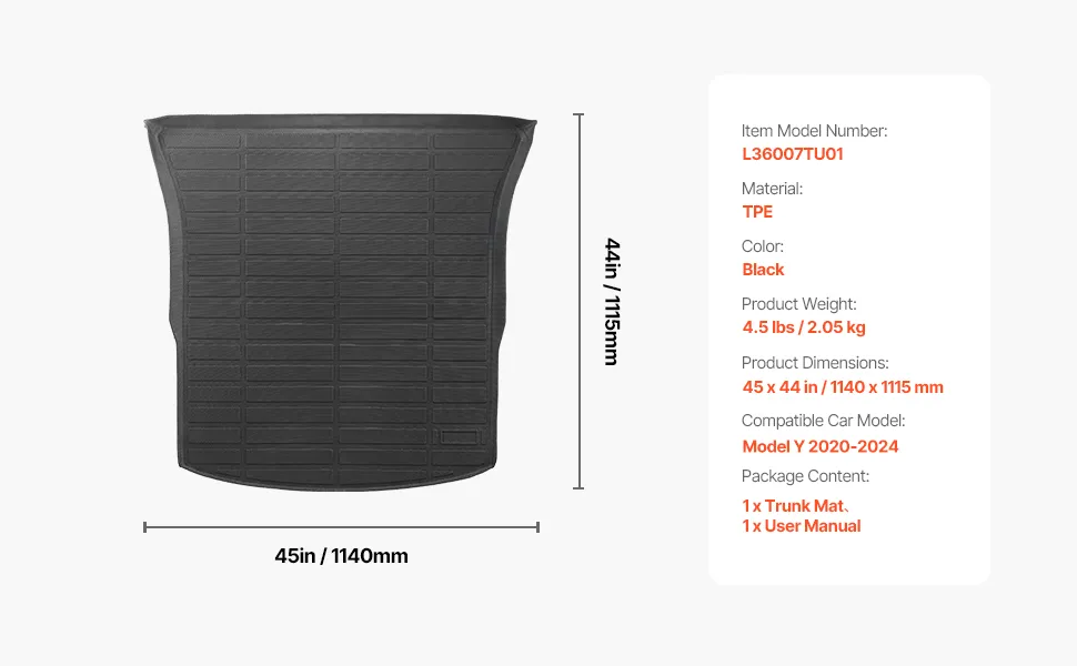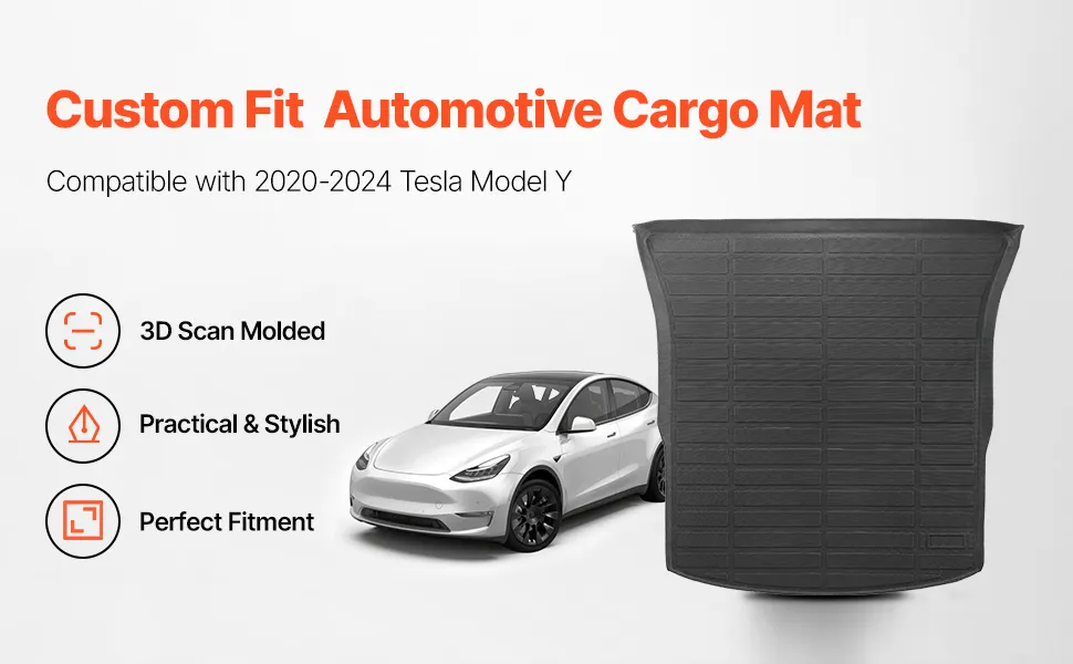 Our custom-fit cargo mat is compatible with 2020-2024 Tesla Model Y. Featuring precise 3D laser scanning molding, all-weather TPE material, anti-slip texture, and easy installation, it ensures a perfect fit and keeps your car's interior clean and pristine.