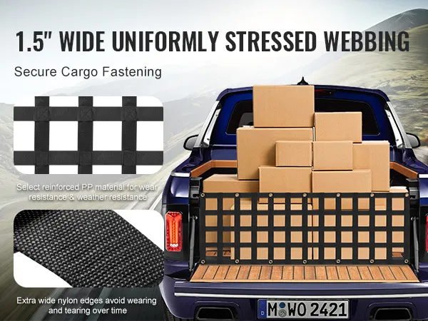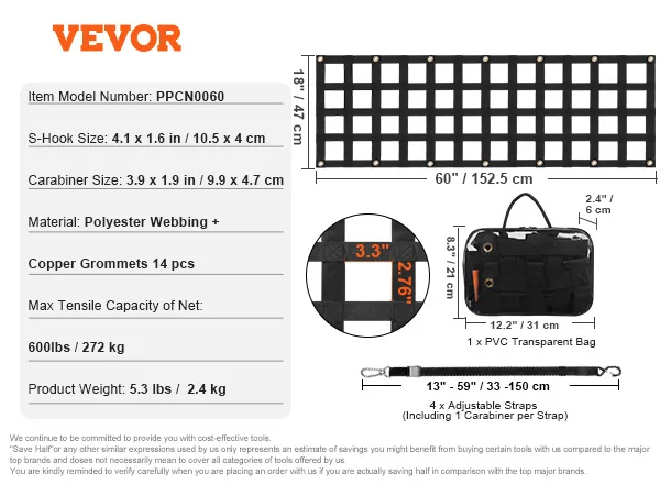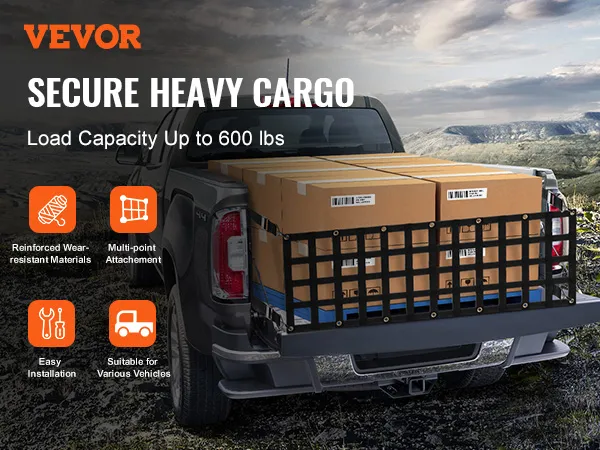 VEVOR tailgate net has a load bearing capacity of up to 600 lbs, 60" x 18" is more suitable for full-size trucks. Moreover, our tailgate net is also suitable for securing a variety of extra-long and heavy-duty cargos, which makes the transportation of cargos is more secure.