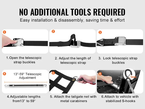 Each telescopic strap comes with a carabiner and S-hook, easy to install and disassemble without tools. Note: Tailgate net requires fixed anchors or bolts to be used.