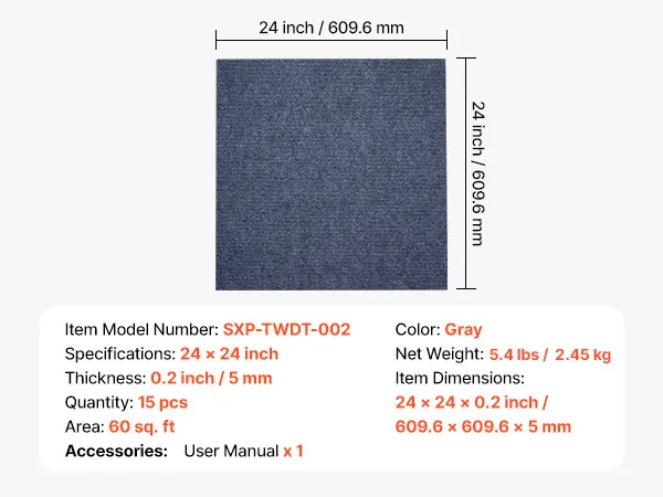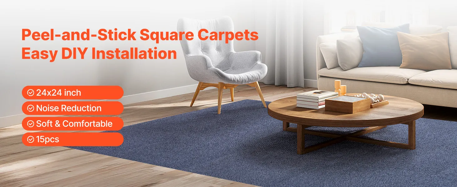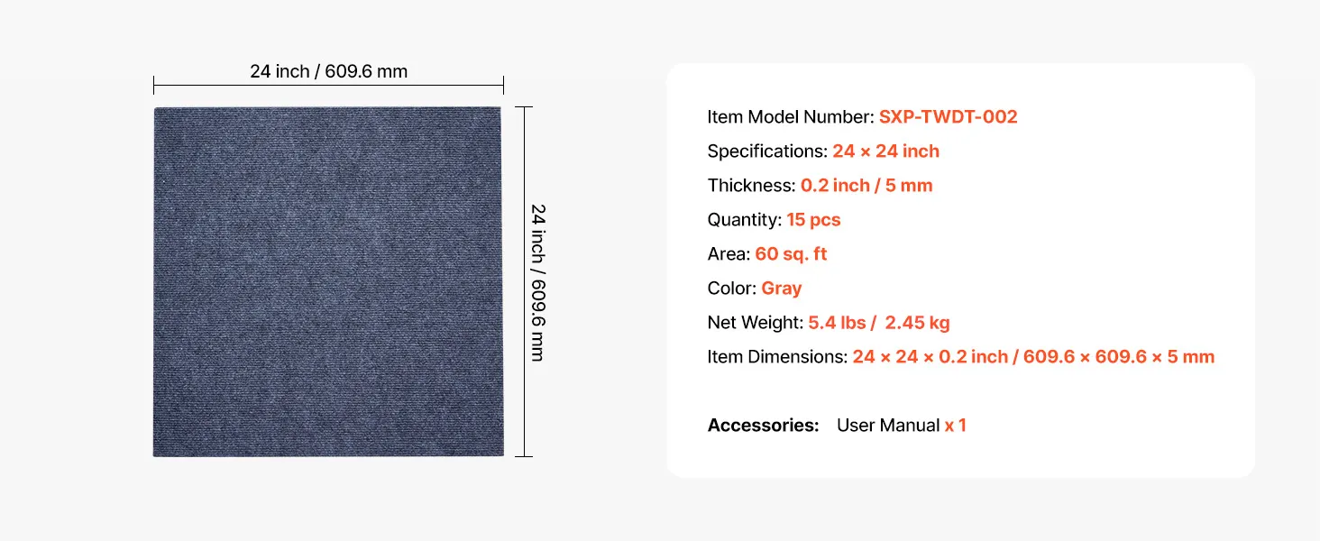 Carpet Tiles Set: This full set includes 15 carpet tiles, each measuring 24x24 inch. When assembled, the carpet square configuration covers 60 sq.ft. The modular design makes installation quick,even one person can complete it effortlessly