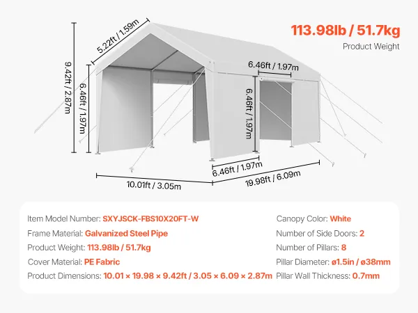 VEVOR Carport, 10 x 20 FT Outdoor Car Canopy, Potable Carport with Removable Sidewalls & Door, Heavy Duty Car Shelter, UV-Resistant & Water-Resistant, All-Season Protection for Automobile Boat White