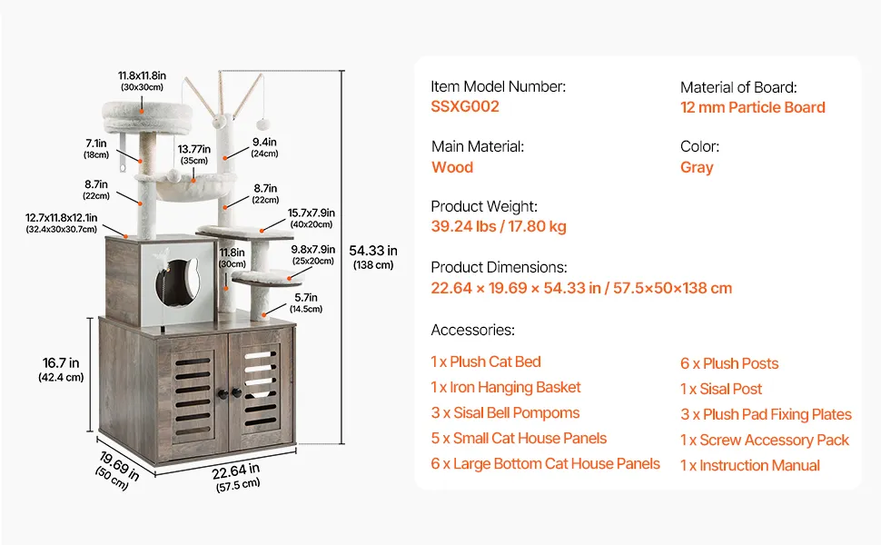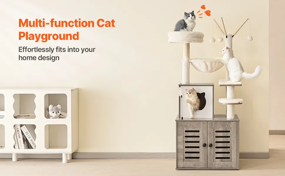 Multi-Functional Cat Condo: Say goodbye to clutter! This 2-in-1 cat tree combines a litter box enclosure with a multi-level cat climbing tower, providing your cat with a private space and a fun play area. The litter box enclosure helps reduce unwanted smells and scattered litter, keeping your home clean and elegant. Compatible with litter boxes sized 21.46 x 18.90 x 15.35 in / 54.5 x 48 x 39 cm.