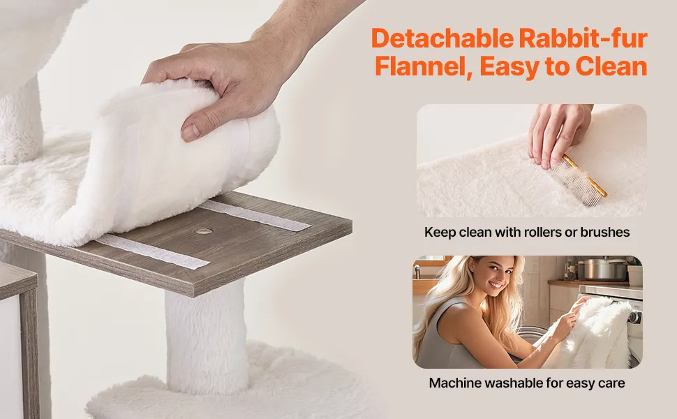 Easy-to-Clean Cushion: Give your cat the cloud-like comfort it deserves! This large cat tree features soft faux rabbit fur cushions on each level, enhancing grip while providing a cozy spot to rest. With detachable, washable pads, this cat tree is both comfortable for your cat and easy to maintain for you.