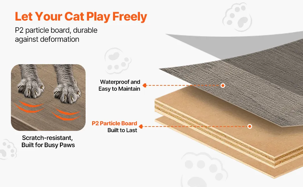 Built with high-quality P2-grade particleboard, this cat tree is sturdy, durable, and scratch-resistant. It’s great for energetic cats and won’t easily lose its shape. Plus, the surface is waterproof and easy to wipe clean, so your furniture stays looking new.