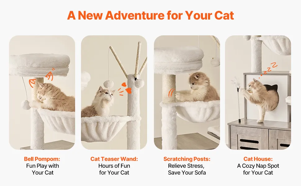 This cat tower includes fun toys like a dangling ball and a teaser stick to spark your cat's curiosity and playfulness. The natural sisal posts satisfy their scratching instincts, while the multi-level design provides endless opportunities for climbing, jumping, and lounging.