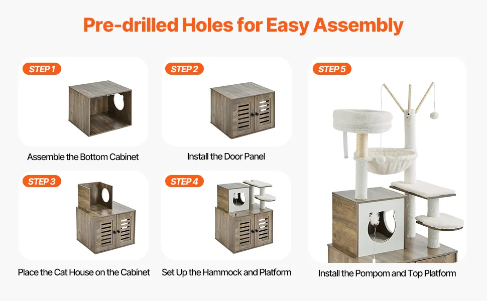 Quick Setup, Instant Fun: Setting up your cat tree has never been easier. With pre-drilled holes and all the tools included, you'll have your cat’s new playground ready in no time. Get your furry friend’s space set up quickly, and let them start exploring their new multi-level condo.