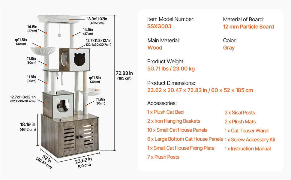 Multi-Functional Cat Condo: This 2-in-1 cat tree combines a litter box enclosure with a multi-level cat climbing tower, providing your cat with a private space and a fun play area. The litter box enclosure helps reduce unwanted smells and scattered litter, for clean and elegant home. Compatible with litter boxes sized 22.44 x 19.69 x 16.93 in. With a maximum platform gap of 23.62 in, this cat tree is not suitable for kittens. It is designed for medium to large cats with strong jumping ability.