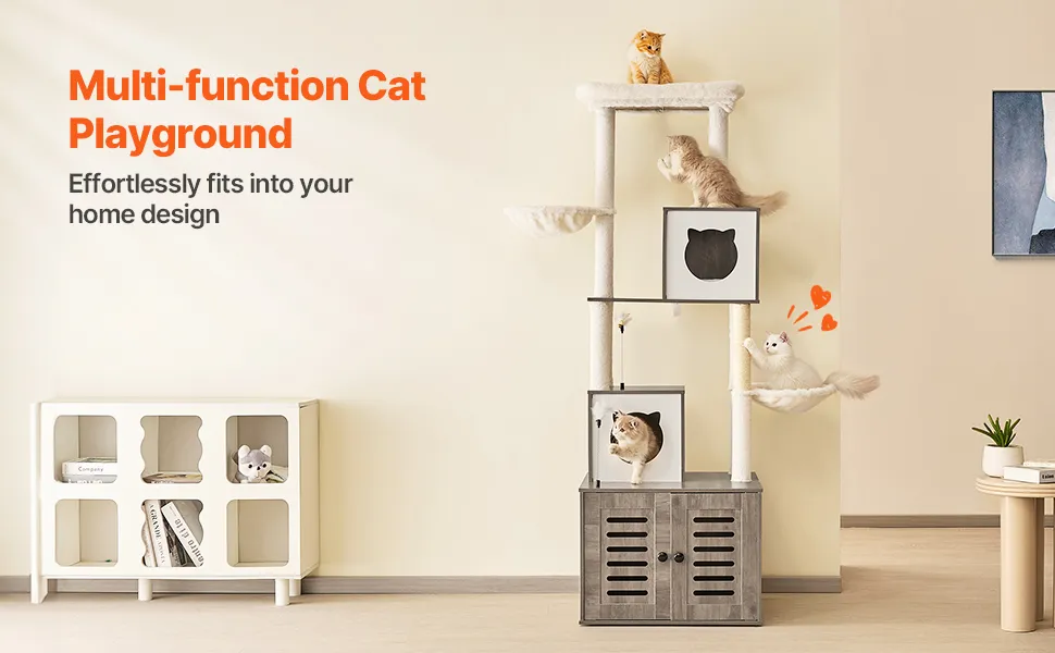This multifunctional cat tree is ideal for both play and relaxation. With sisal posts for scratching, a comfy faux rabbit fur pad, and a built-in litter box enclosure, it keeps your cats entertained and your home smelling fresh.