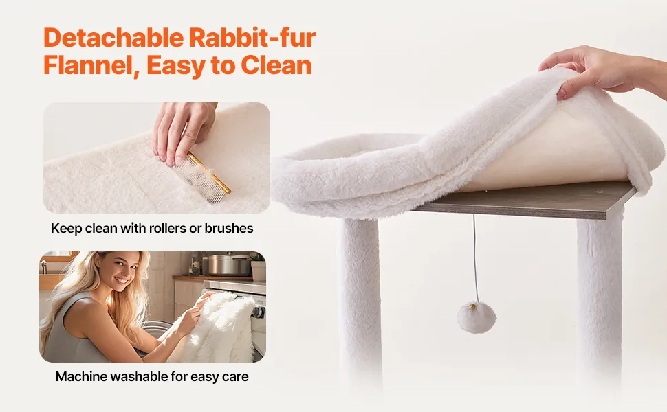 Easy-to-Clean Cushion: Give your cat the cloud-like comfort it deserves! This large cat tree features soft faux rabbit fur cushions on each level, enhancing grip while providing a cozy spot to rest. With detachable, washable pads, this cat tree is both comfortable for your cat and easy to maintain for you.