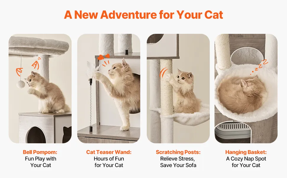 This cat tower includes fun toys like a dangling ball and a teaser stick to spark your cat's curiosity and playfulness. The natural sisal posts satisfy their scratching instincts, while the multi-level design provides endless opportunities for climbing, jumping, and lounging.
