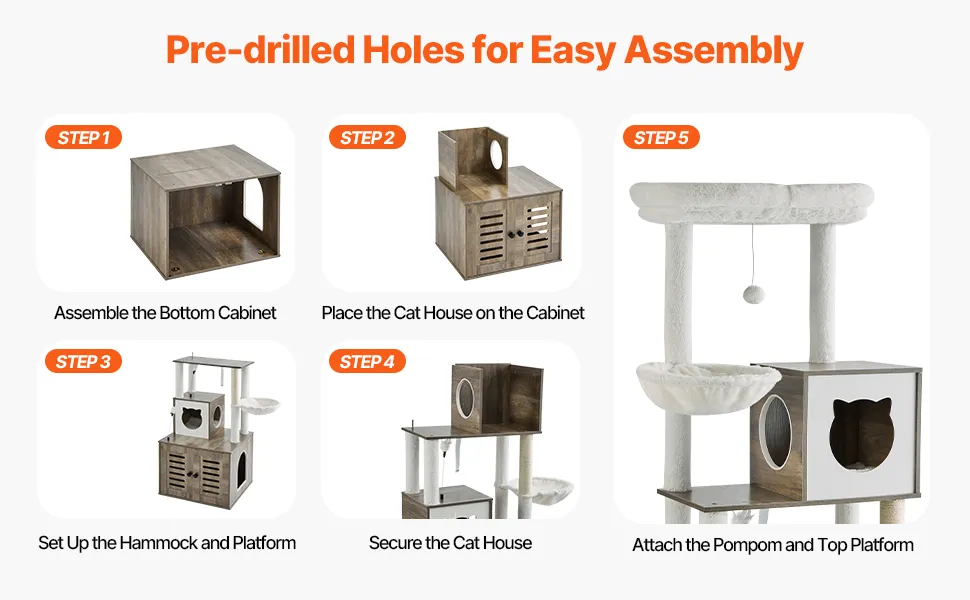 Quick Setup, Instant Fun: Setting up your cat tree has never been easier. With pre-drilled holes and all the tools included, you'll have your cat’s new playground ready in no time. Get your furry friend’s space set up quickly, and let them start exploring their new multi-level condo.
