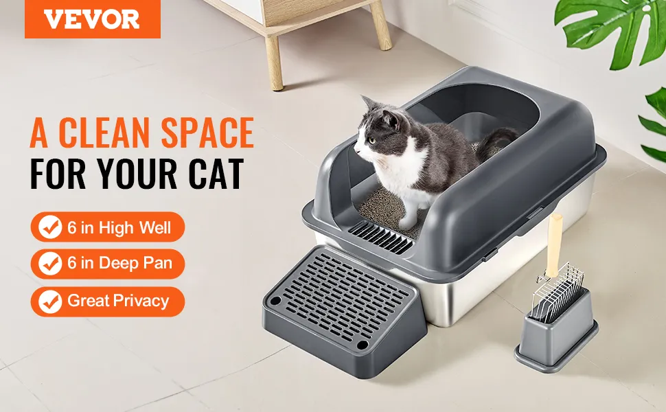 VEVOR Cat Litter Box, 6 inches Deep, XL Extra Large Stainless Steel Cat Litter Box with Scoop, Wide Filtering Foot Board & High Sides, Enclosed Odor-Free Easy-to-Clean Litter Box, Fit for Big Cats