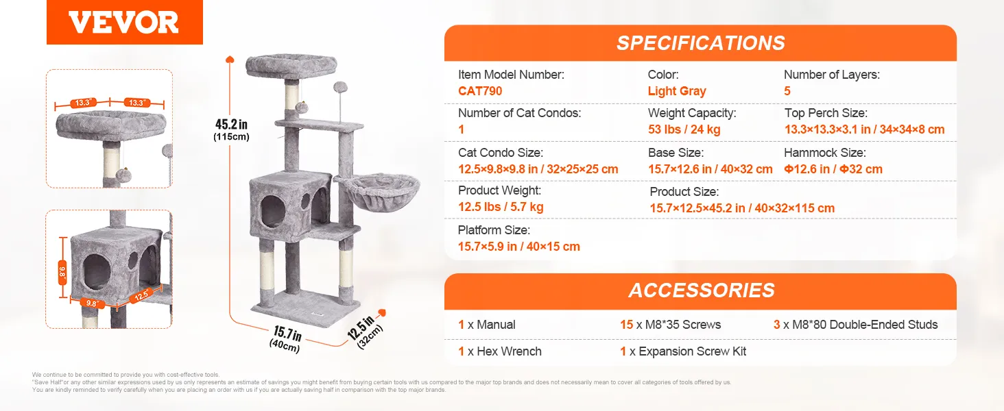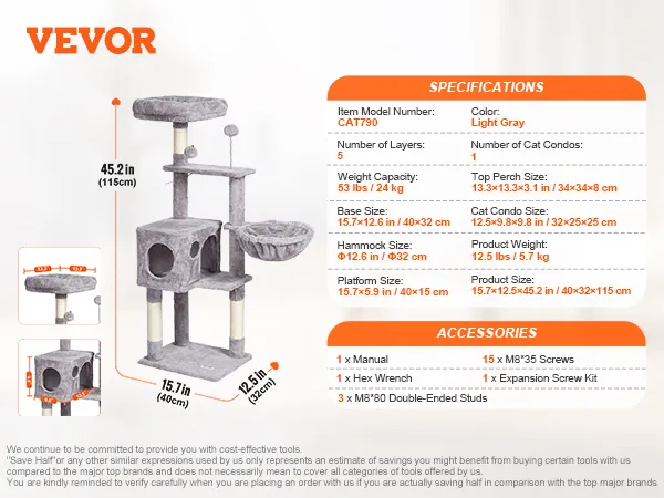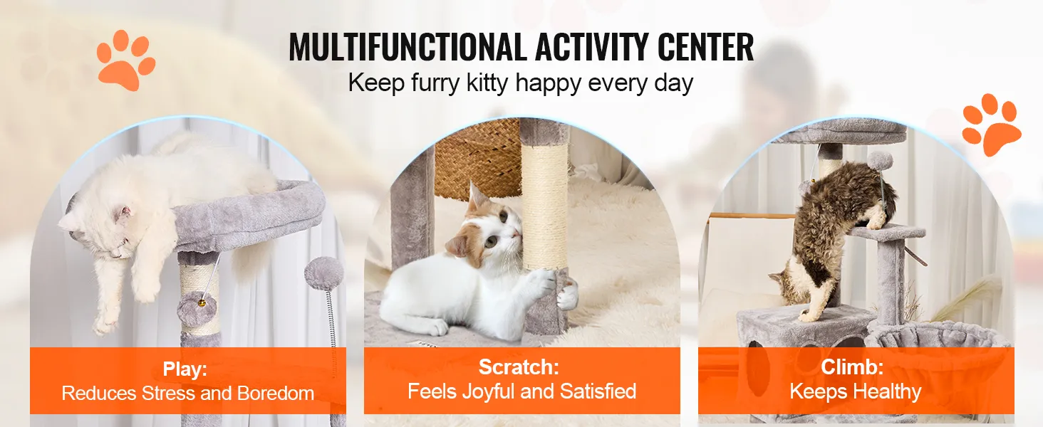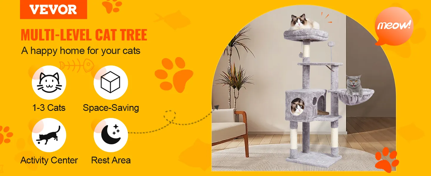 Setting up the VEVOR cat tree is easy. The pre-drilled holes make the process quick and easy, making it a hassle-free option. There are detailed assembly instructions and all necessary tools included. Even first-time users can assemble it without any trouble. This saves time and effort; this allows you to set it up and let your cats enjoy it immediately. The simple installation process makes it an easy choice for busy pet owners.