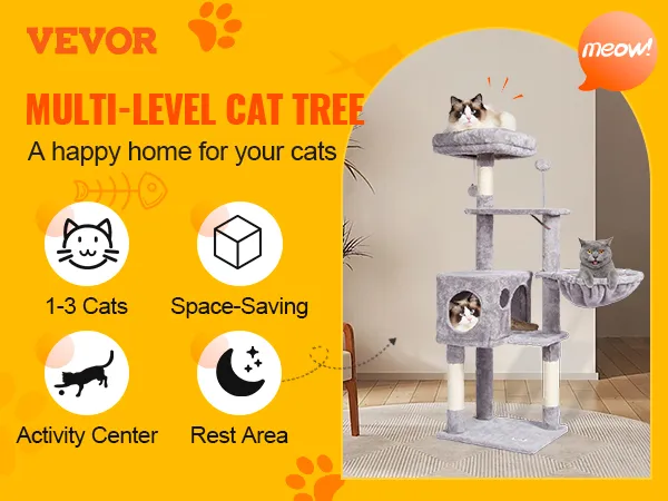 The VEVOR cat tower is made with P2-grade particle board. Its wide base and thick sisal poles provide stability. An anti-toppling strap provides extra safety, preventing tipping. This makes it ideal for homes with active cats. The strong design can support up to 53 lbs, so multiple cats can play and rest simultaneously. The materials are safe for cats, ensuring they can enjoy the tree without risks. Pet owners find this cat tree to be a reliable and durable option.