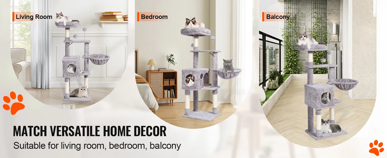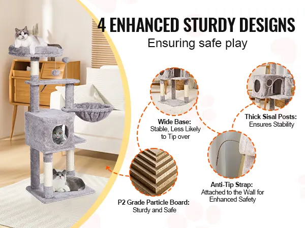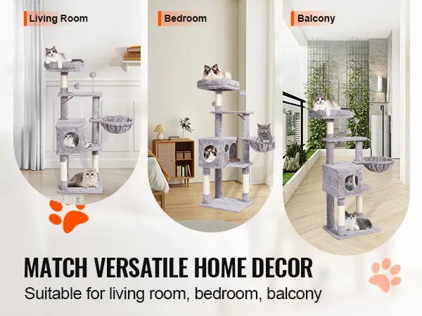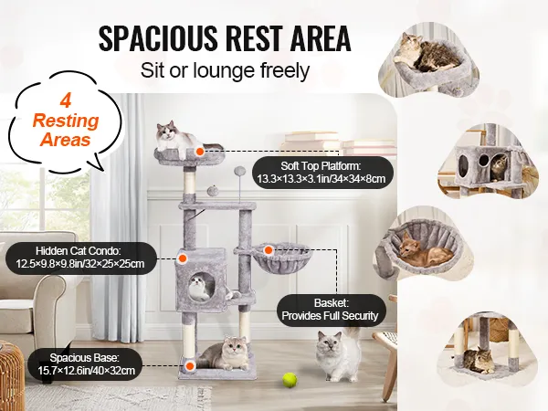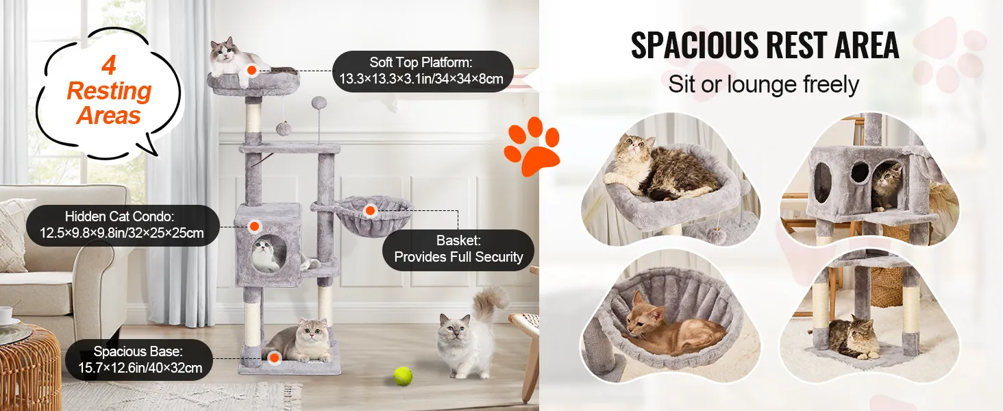 The multiple resting areas are available in this cat tree. The spacious cat condo and hammock provide cozy spots for cats to relax. The plush surfaces are gentle on cats' skin and claws. The cats can choose where to sleep according to their mood. Whether they want to be up high or in a cozy corner, this tree caters to the needs of its users. This ensures a secure resting environment for your cats, making it an ideal addition to any home.