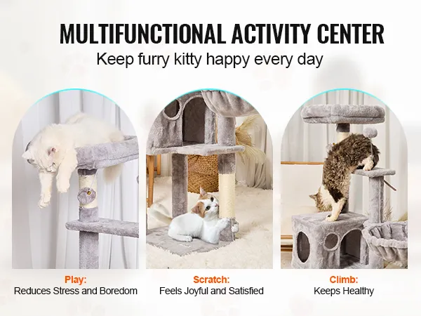 The VEVOR cat tree is a special model for small to medium cats. It has multiple levels so that cats can climb freely. Each platform is spacious and sturdy, offering an entertaining climbing experience. The top perch, low resting area, and spacious condo provide ample space for multiple cats in the best environment. The light grey color matches well with home decor. This light grey cat tree is a perfect addition to any living space, adding functionality and style. No matter if it's for home use or in a t-shirt shop like a poop store, these cat trees are an excellent choice.