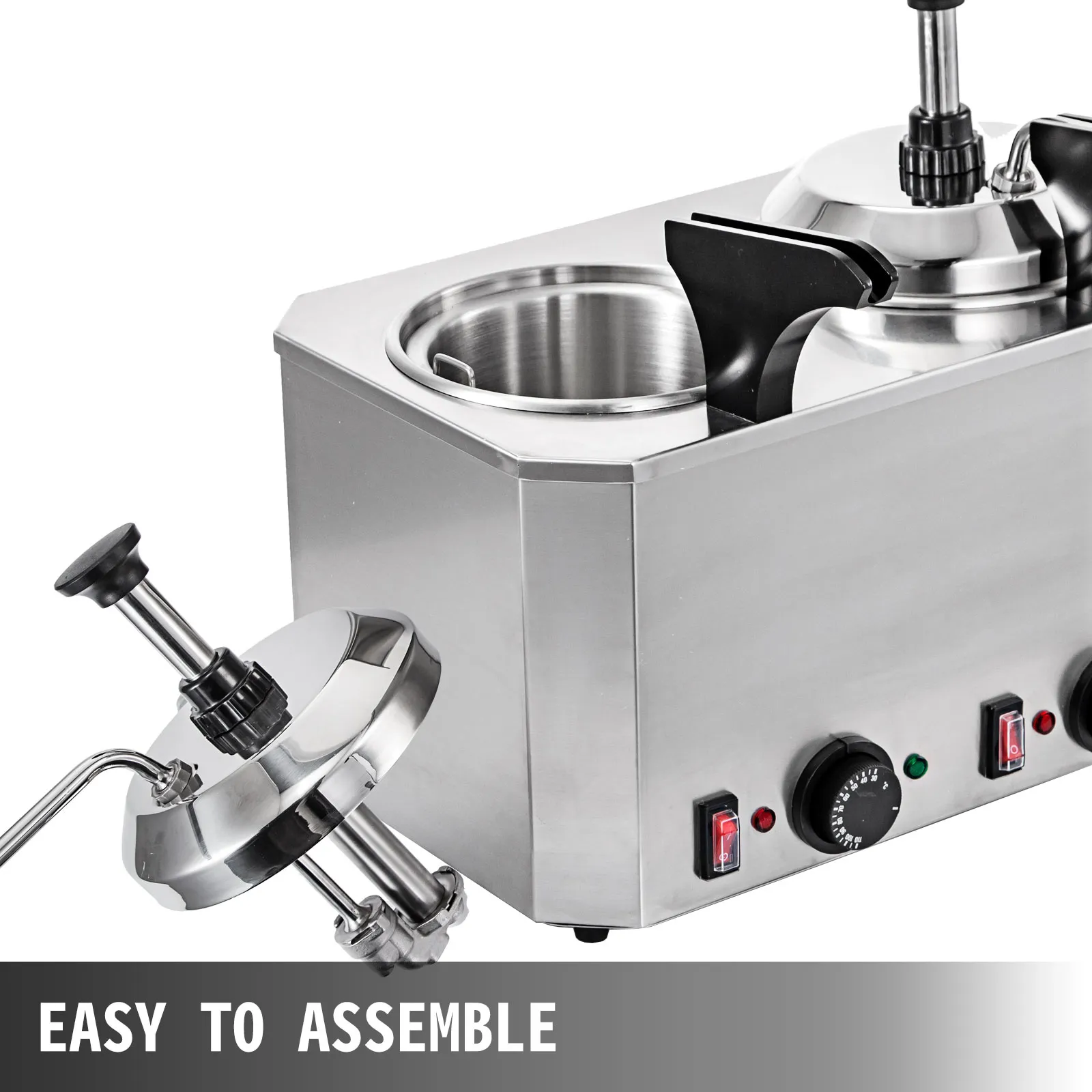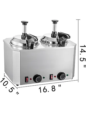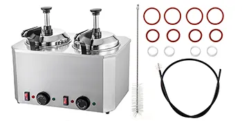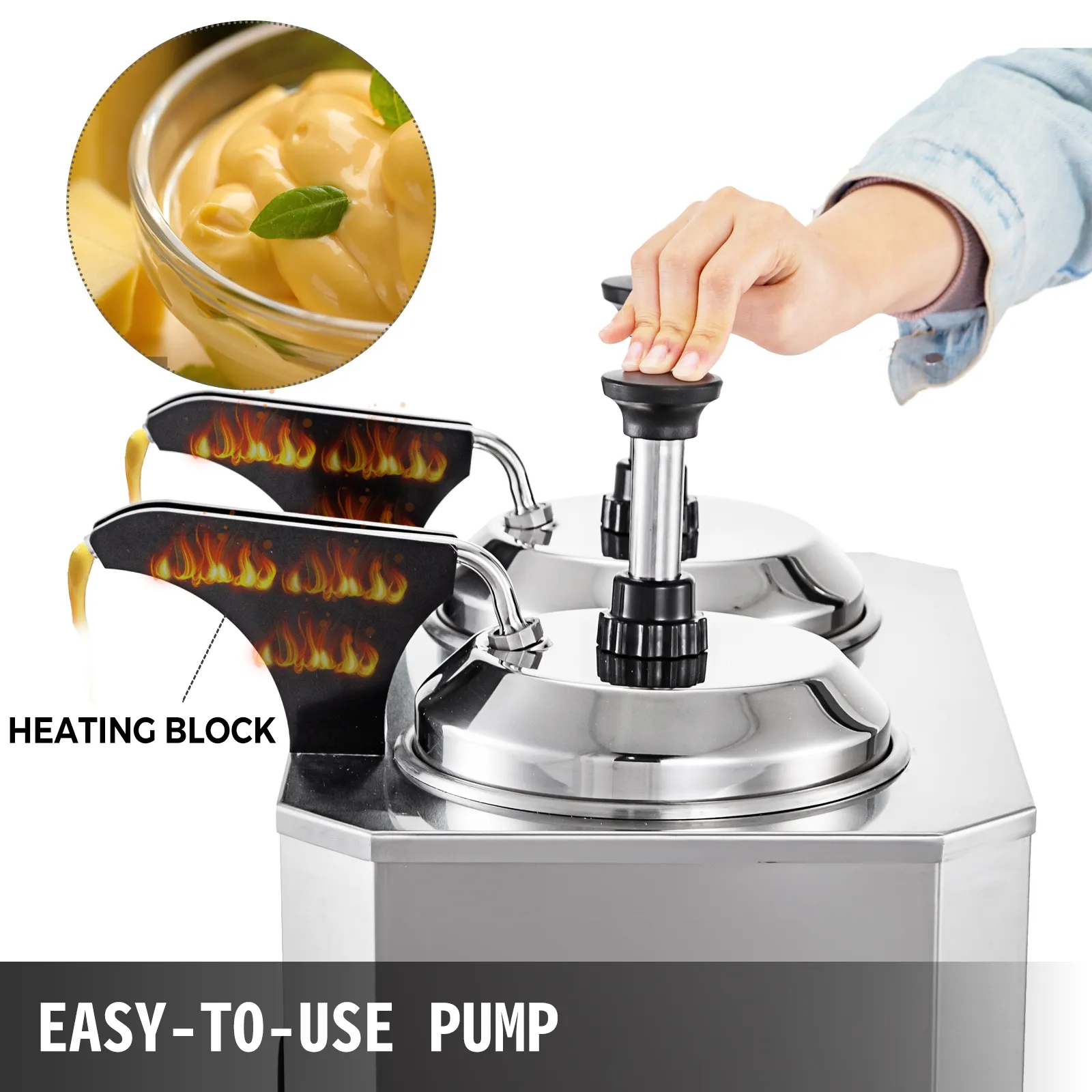 This cheese pump dispenser is equipped with 2 warming tank, which can accept 2.5L (0.66 gal)*2 nacho cheese, or hot fudge.