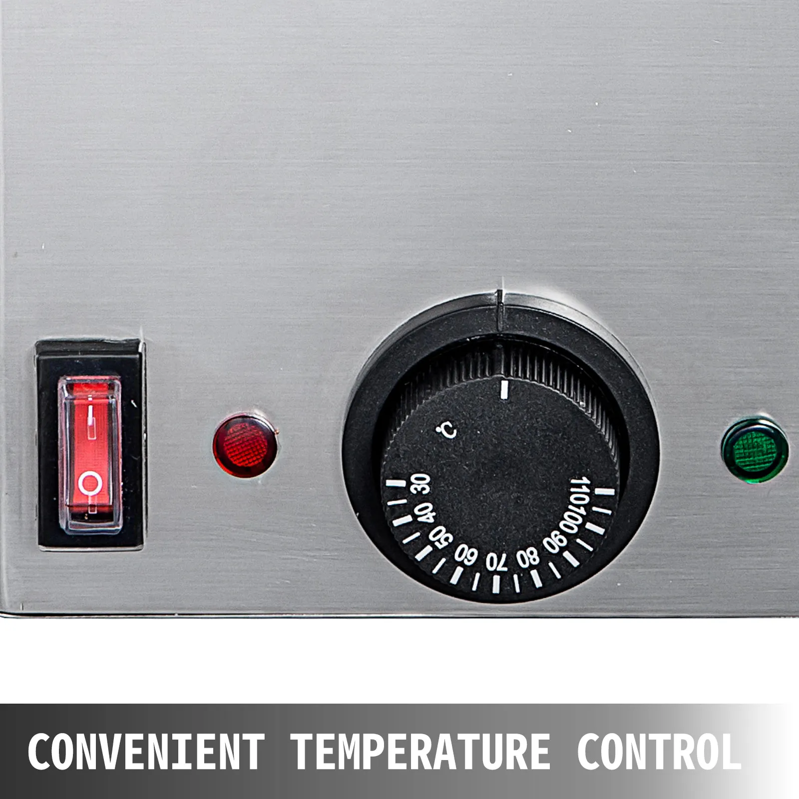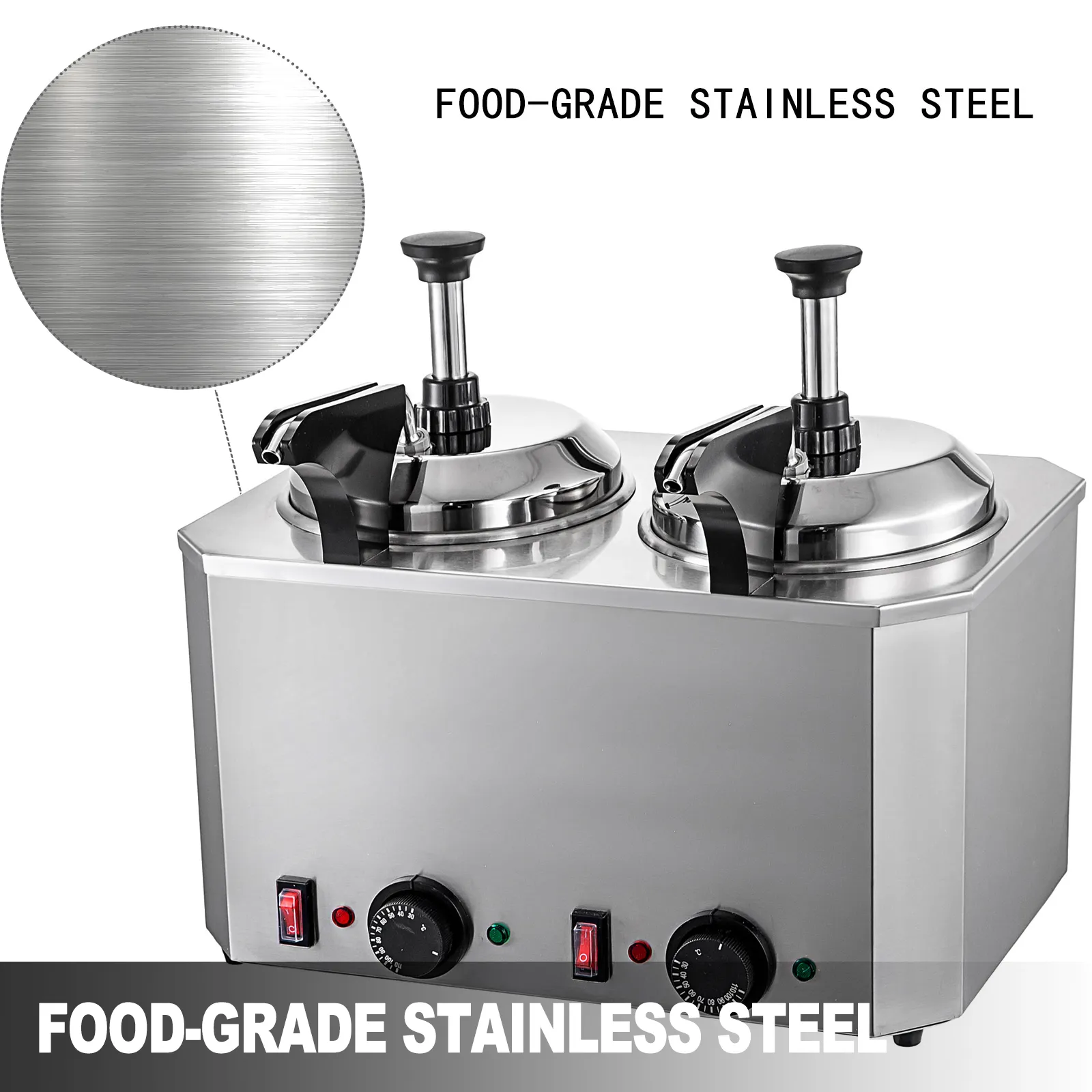 Nacho cheese dispenser warmer, equipped with 2 pumps, is made of all food-grade stainless steel. Anti-rust, anti-corrosion, and easy cleaning. The nacho cheese and sauces can be warmed up from 30℃ to 110℃. It adopts 2 large capacity warming tanks of 2.5L, perfect for melting nacho cheese, hot fudge, and other sauces.