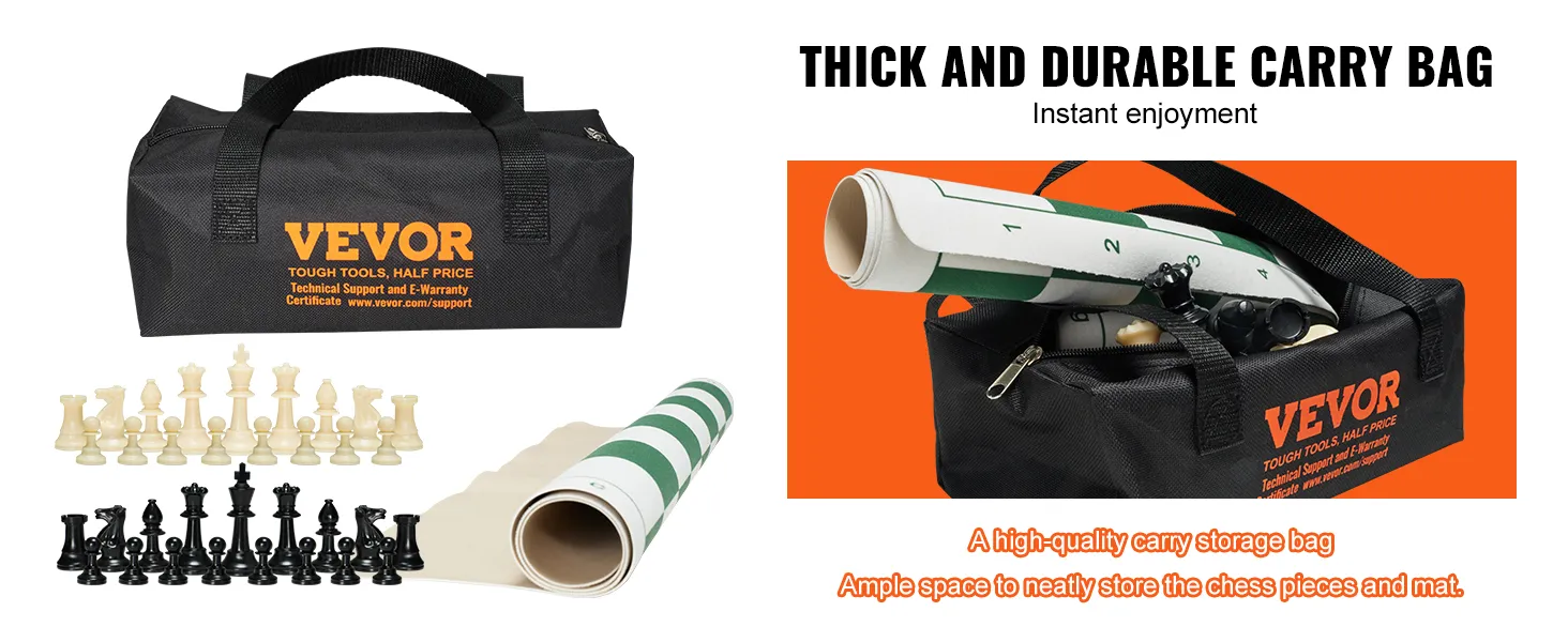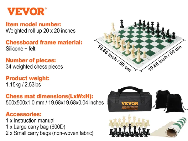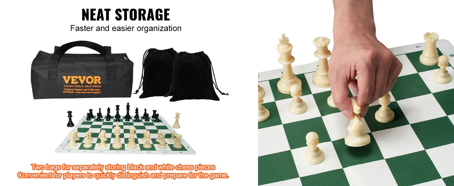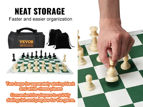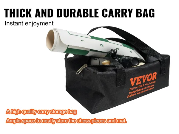 This foldable silicone chess game is also easy to set up and store the VEVOR tournament chess set. The board can be quickly rolled out and placed flat. It's super easy to roll up and put away. Silicone material ensures the board stays flat during play. Easy cleaning adds to its convenience due to the foldable design. You can easily carry it in the included bag. This set is perfect for anyone who wants a hassle-free experience with their chess setup.