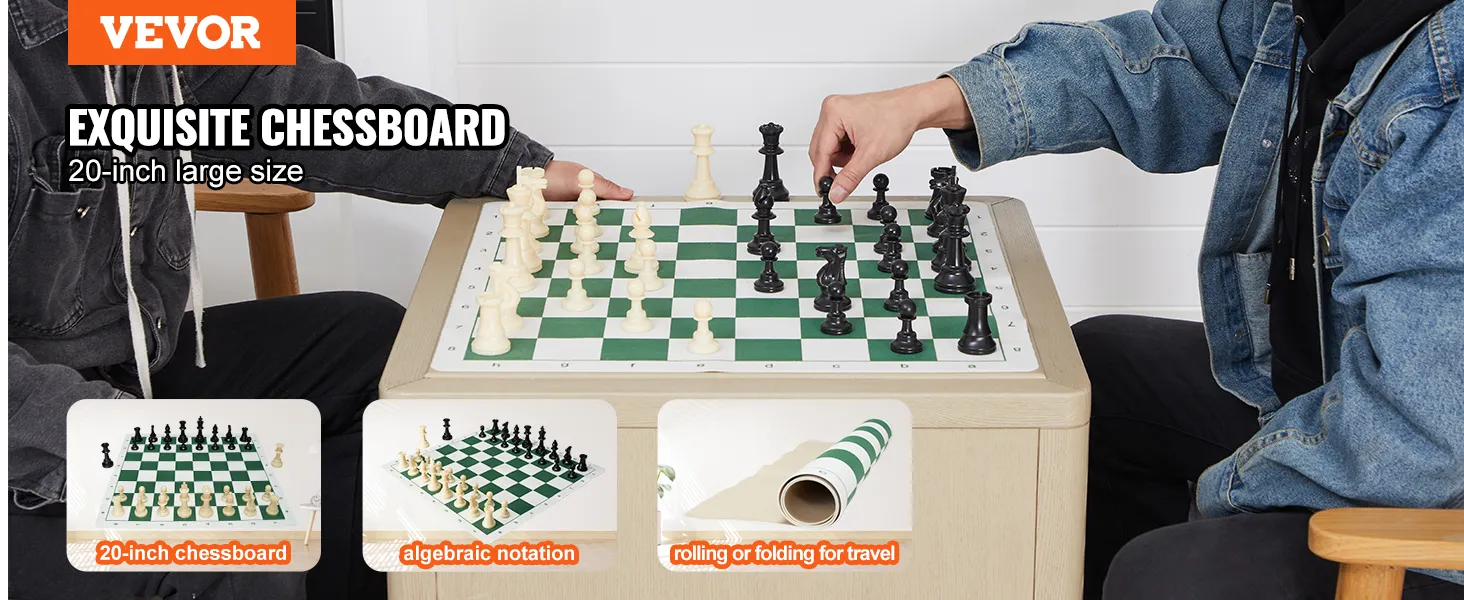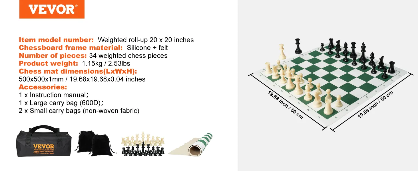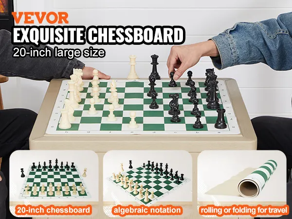 This 20 inch roll-up chess board features a 20-inch silicone board. These features ensure the board remains flat and is easy to clean. Like an iPad, The board is thin but offers excellent quality. The green and white contrast makes it easy to view the pieces. It can last through many games. You can store and transport this roll-up chess board easily. This reliable choice will meet your performance expectations regardless of your skill level.