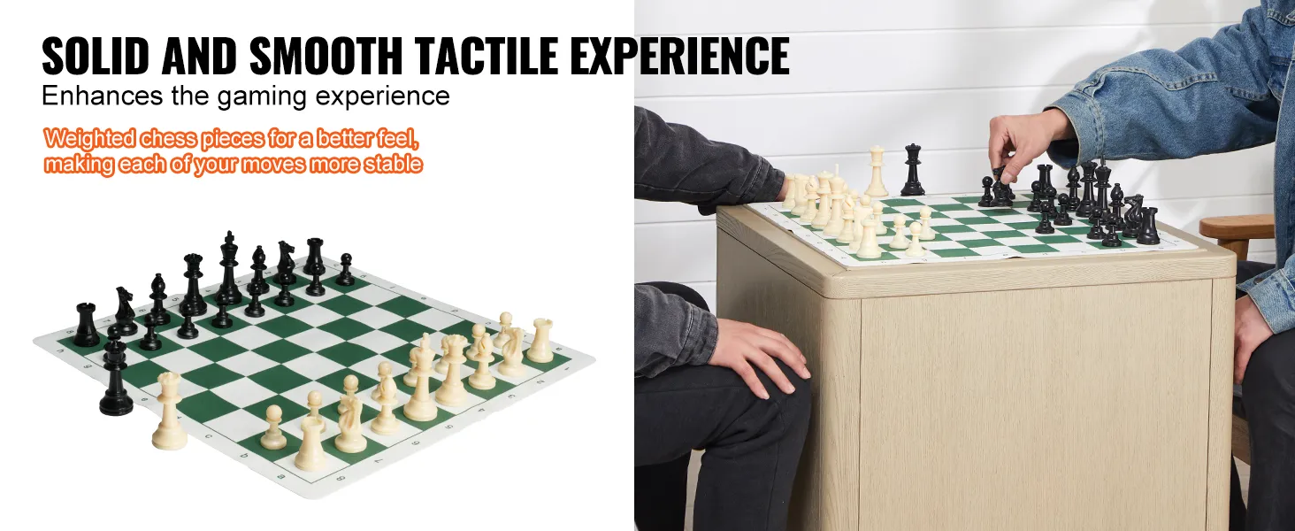 The checkers pieces are part of the VEVOR tournament chess set. They add value to the set, giving you two games in one. The checkers' pieces are made from the same quality material as the chess pieces. This makes the set versatile and perfect for anyone who enjoys both games. The extra pieces make it a great gift option, too. It is ideal for family game nights or for playing with friends. This added value makes this set incredibly valuable for any game enthusiast.