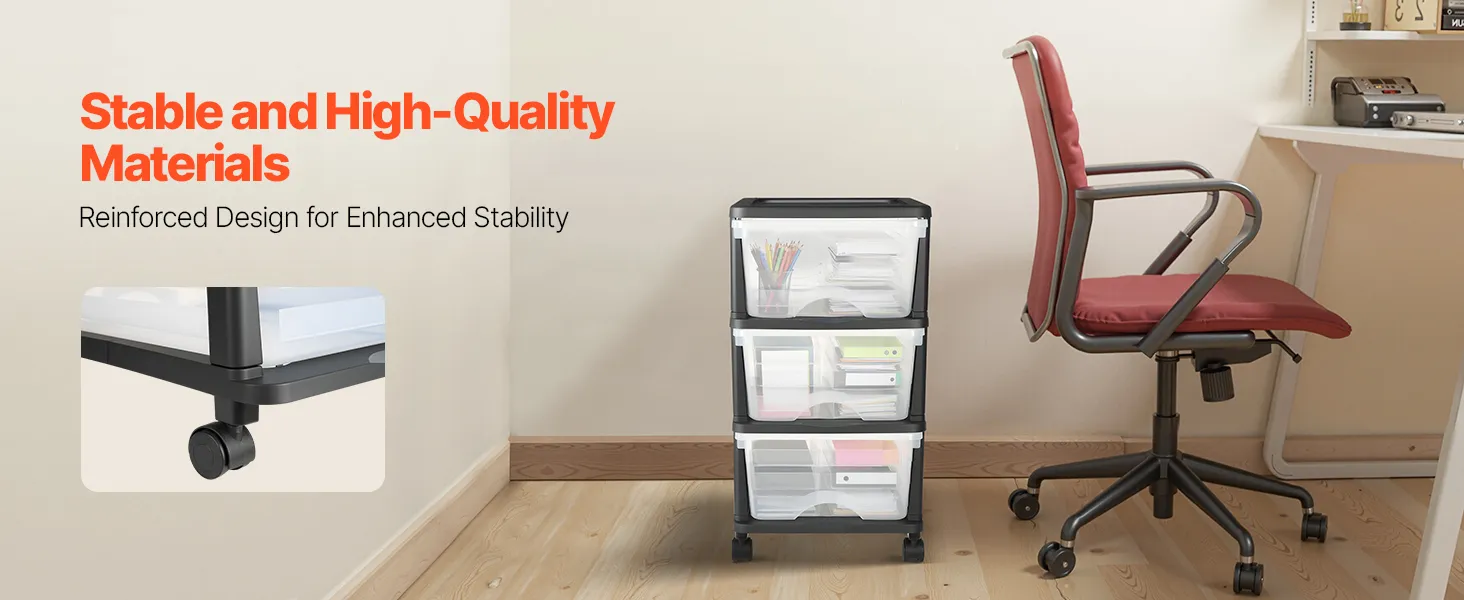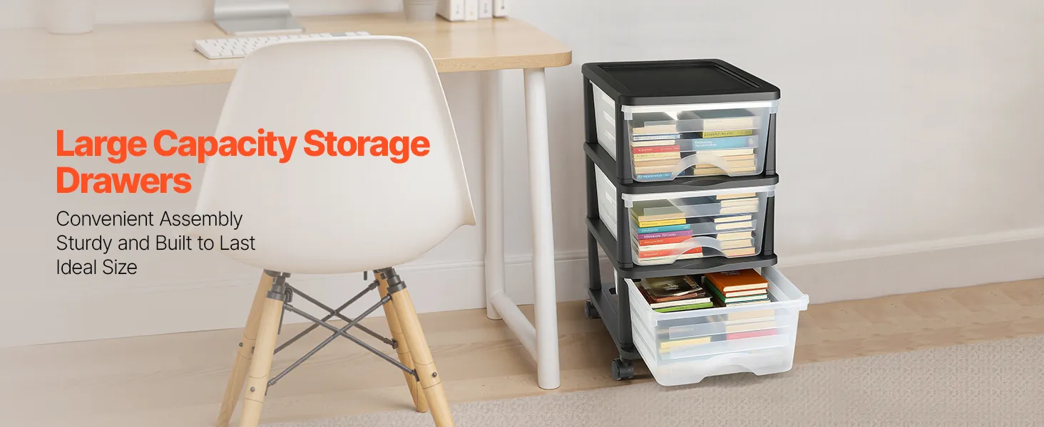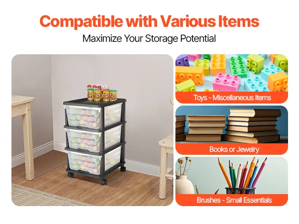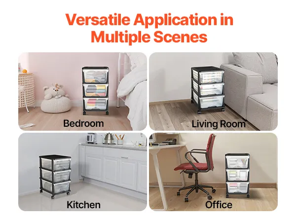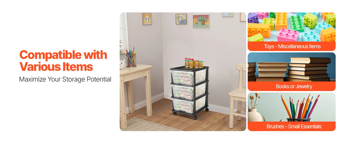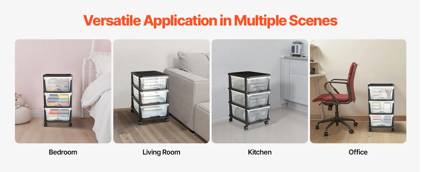 • Visible for Easy Access: The transparent front panel allows users to see the contents clearly, saving time when searching for items. The sliding plastic drawers storage design makes it easy to retrieve items, enhancing storage efficiency