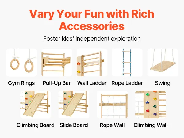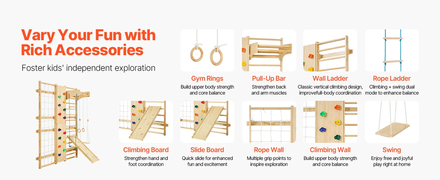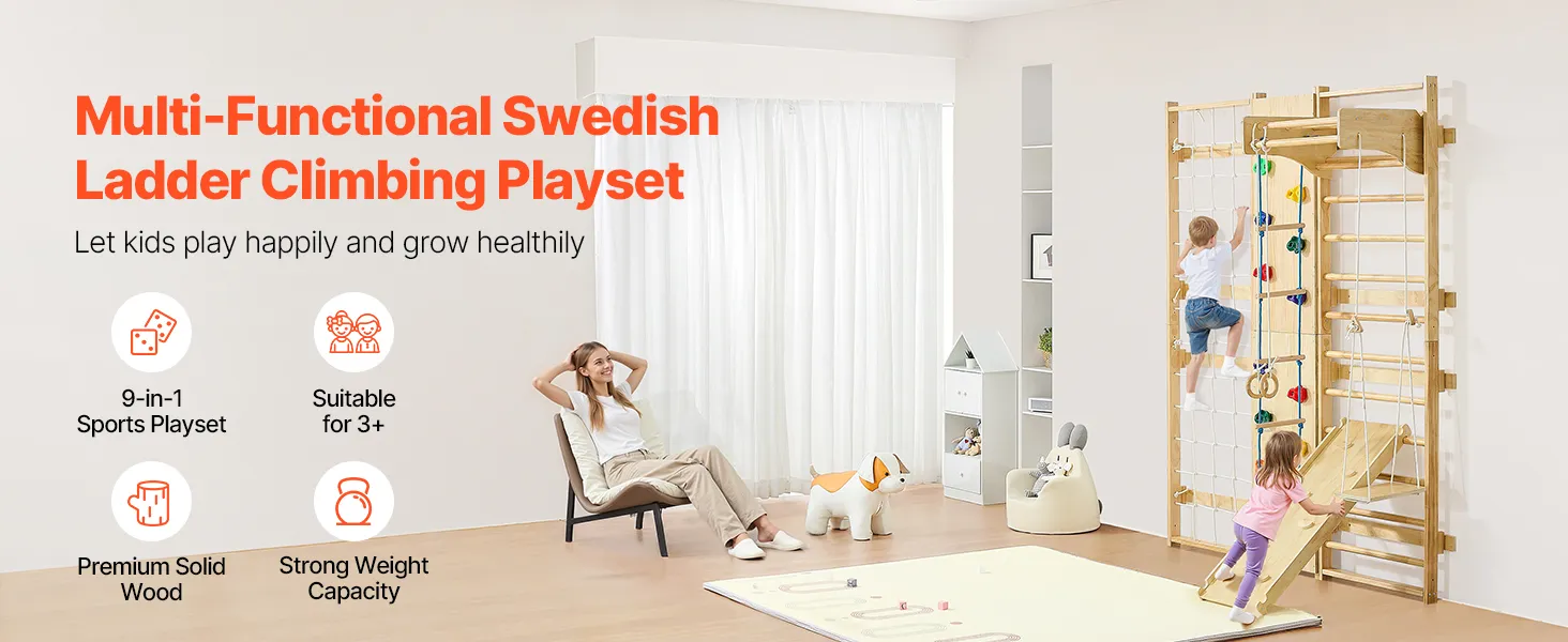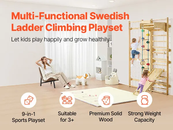 9-in-1 Wall Gym Climbing Playset: This 9-in-1 12-level Swedish ladder wall gym features gym rings, pull-up bar, rock climbing wall, swing, rope wall, rope ladder, wall ladder, climbing board, and slide board, providing endless fun while helping your child stay active and explore new challenges