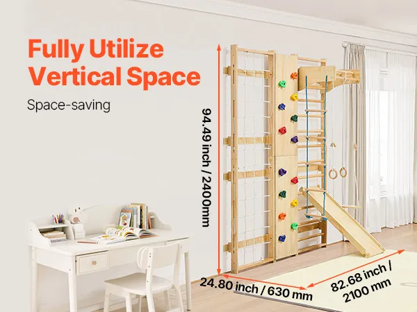 With a wall-mounted design, this VEVOR indoor jungle gym wall ladder takes up minimal space and easily blends into bedrooms, hallways, and other areas of your home, making it a perfect fit for any room.