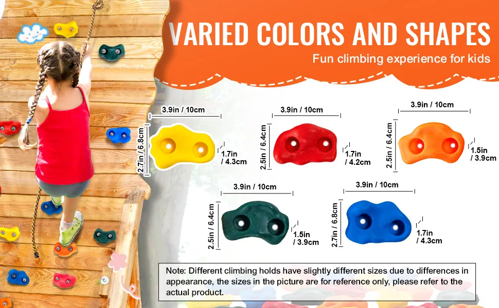 Bright Colors, Varied Shapes: No phone addiction, only happy climbers! The vibrant colors and varied shapes easily capture children's attention, shifting their focus from electronic devices to climbing! The rock wall climbing holds allow kids to build strength, coordination, and confidence while having endless fun during playtime.