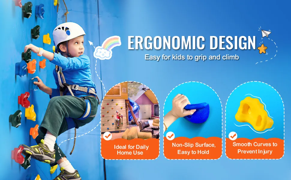 Large, Easy-to-Grip Holds: The climbing wall grips come in various sizes. Their unique anti-slip textured surface makes them easy to grip and step on, providing a safe and comfortable hold for children while climbing. This activity helps improve children's hand-eye-foot coordination, develops their sense of balance, enhances concentration, and builds confidence and courage.