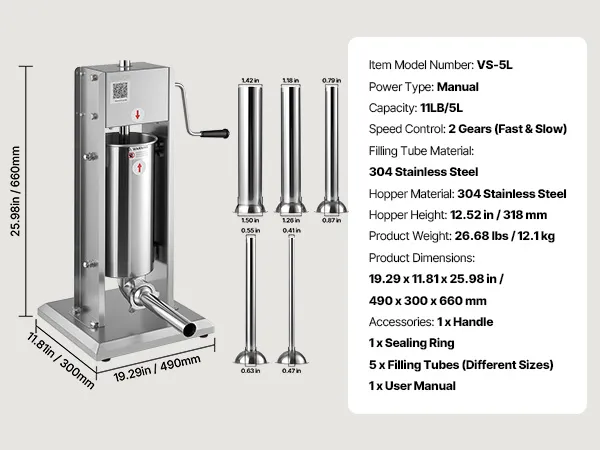 VEVOR Manual Sausage Stuffer, 11 LBS / 5 L Vertical Meat Stuffer, Dual-Speed Sausage Casing Meat Filling Machine, Stainless Steel Heavy Duty Filler with 5 Stuffing Tubes, for Commercial & Home Use VEVOR Manual Sausage Stuffer, 11 LBS / 5 L Vertical Meat Stuffer, Dual-Speed Sausage Casing Meat Filling Machine, Stainless Steel Heavy Duty Filler with 5 Stuffing Tubes, for Commercial & Home Use