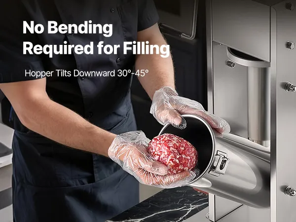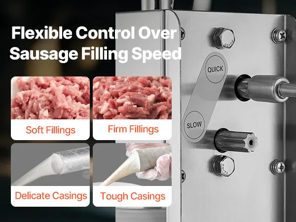 • Dual Speeds: This manual sausage stuffer offers fast and slow modes. High speed is for fast raising and lowering. Use low speed when stuffing. The ergonomic handle fits comfortably in your hand, making the whole process easier and more efficient