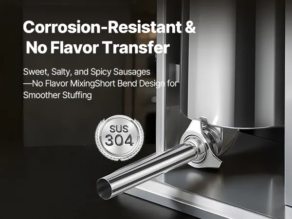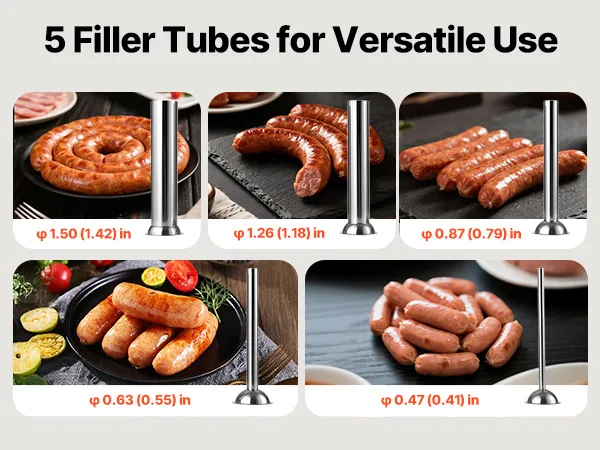 • Versatile Tubes: This vertical sausage filler includes five SUS 304 stuffing tubes: ⌀0.47(0.41) in, ⌀0.63(0.55) in, ⌀0.87(0.79) in, ⌀1.26(1.18) in, and ⌀1.50(1.42) in. All food-contact parts are burr-free and meet food-grade hygiene standards