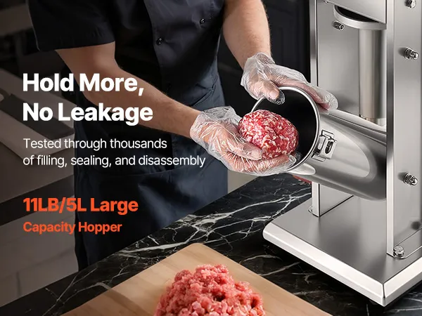 • Large Capacity: The tiltable barrel of this meat stuffer holds 11 lbs / 5 L of meat. Ideal for making more sausages at once, it avoids repeated refills. The barrel, tubes, body, and base are made of stainless steel—durable and rust-resistant