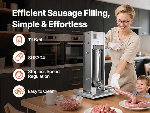 This manual sausage stuffer features an upgraded pressure plate with vent holes, producing firmer sausages with fewer air bubbles. With 2-speed control and an 11 lbs / 5 L large capacity, it's ideal for efficient home sausage making.