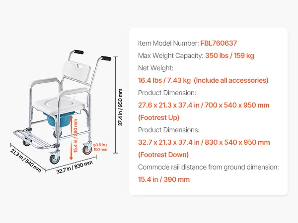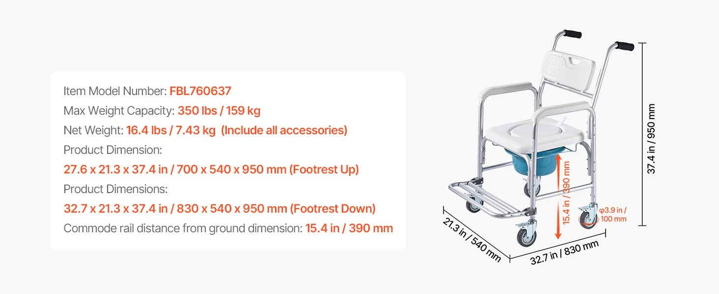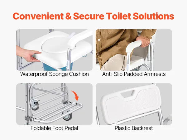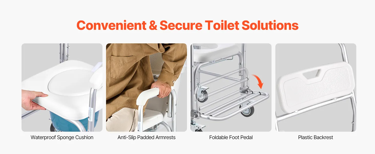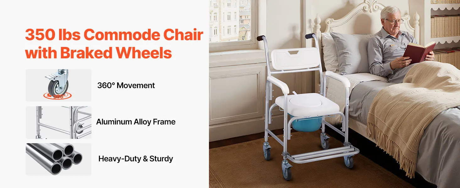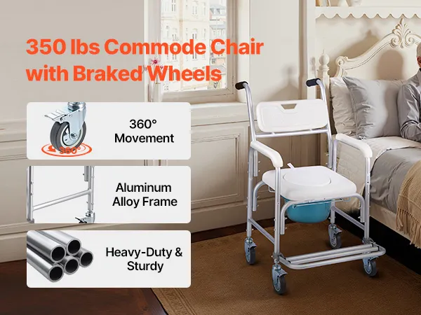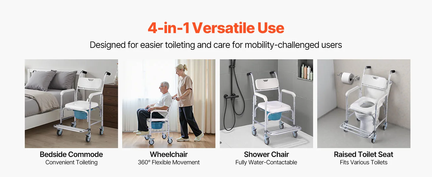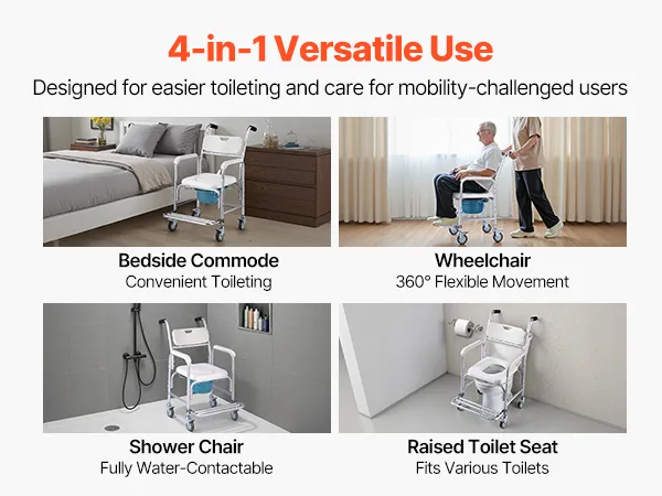 4-in-1 Toilet Commode: Built with a reinforced aluminum alloy frame, our commode supports up to 350 lbs. Use it as a bedside commode, wheelchair, raised toilet seat, or shower chair—one reliable solution for all your in-home care needs