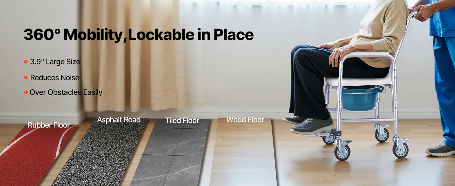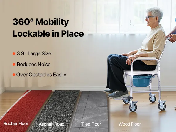 Equipped with 3.9-inch large swivel casters, this bedside commode moves effortlessly across wood, tile, and rubber floors. All four wheels feature locking brakes for secure positioning during use.