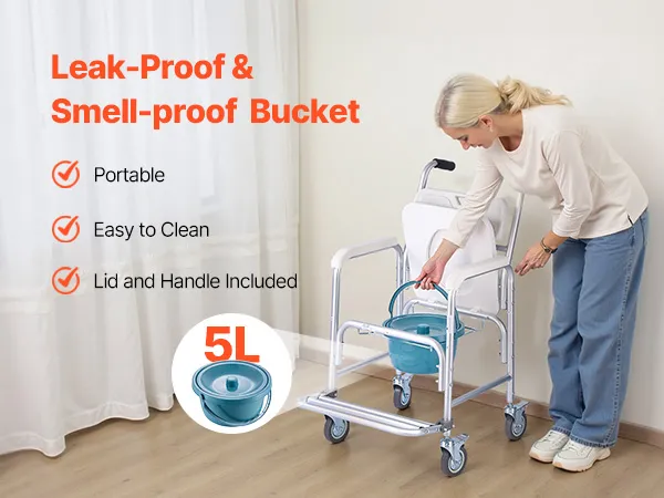 Our adult potty chair includes a detachable 5L bucket with lid to avoid leaks and odors. It's easy to detach and clean, keeping the commode fresh and sanitary.