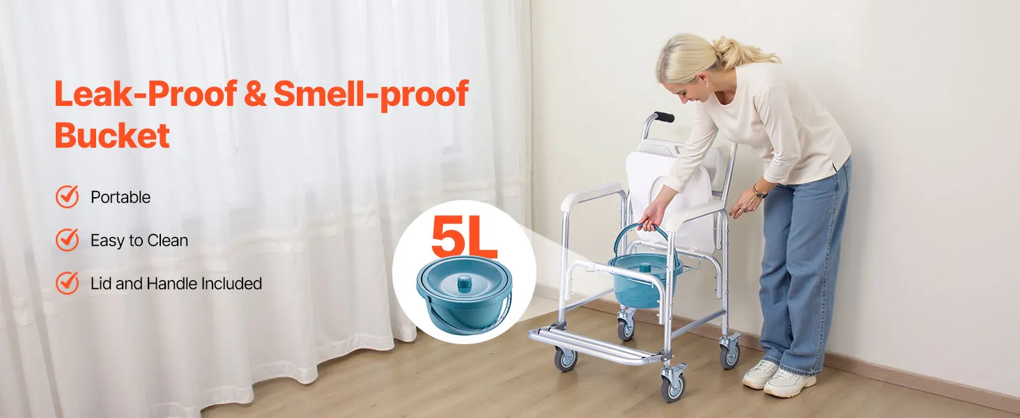 5L Leak-Resistant Bucket: The portable commode includes a detachable 5L bucket with a secure lid to avoid leaks and odors, ensuring a clean user experience. It's easy to empty and clean—perfect for daily care