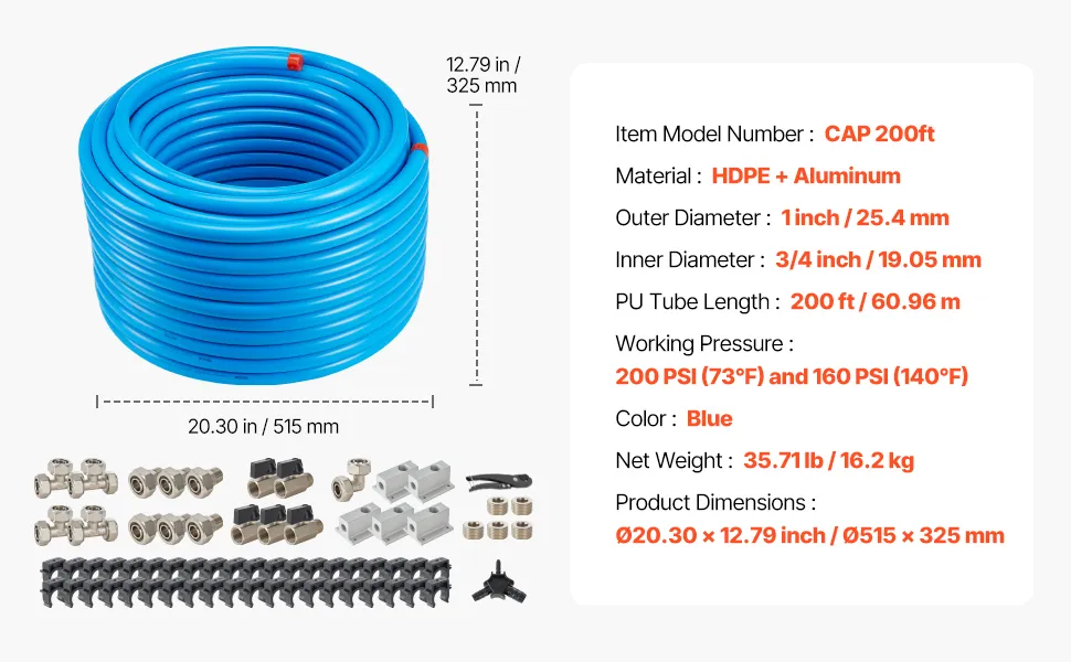 VEVOR Air Compressor Line Kit, 200FT x 3/4", HDPE-Aluminum Compressed Air Piping System, Leak-Proof & Easy-to-Install, Compressed Air Line Tubing Kit for Garages Workshops, Blue