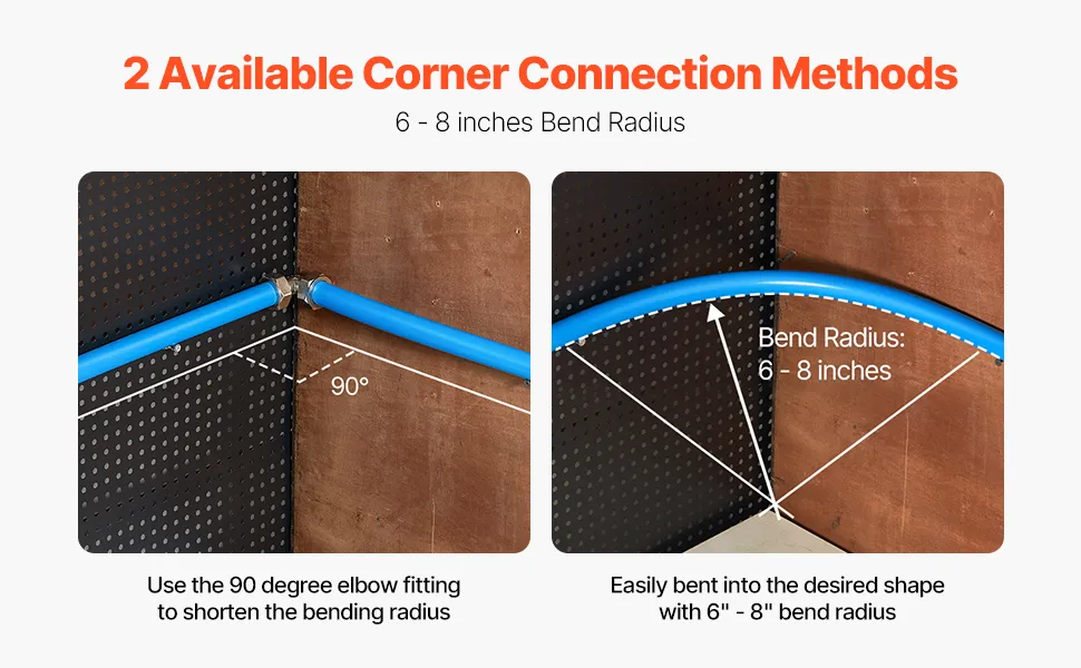 Flexible Installation Options: This compressed air tubing system provides 2 flexible corner connection options. You can select the 90-degree elbow fitting for a right-angle connection ; or choose the radius bend method, allowing you to easily shape the tubing with a bend radius ranging from 6 to 8 inches.