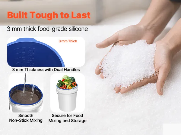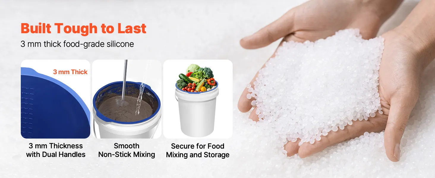 Made of thick silicone with dual handles, this liner fits snugly into standard 5-gallon buckets. Non-stick and smooth for effortless mixing. Secure for direct contact with food. Tough, reusable, and built to last.