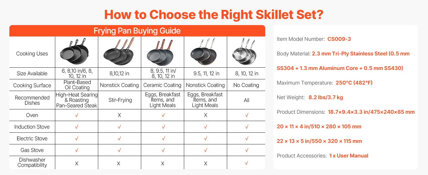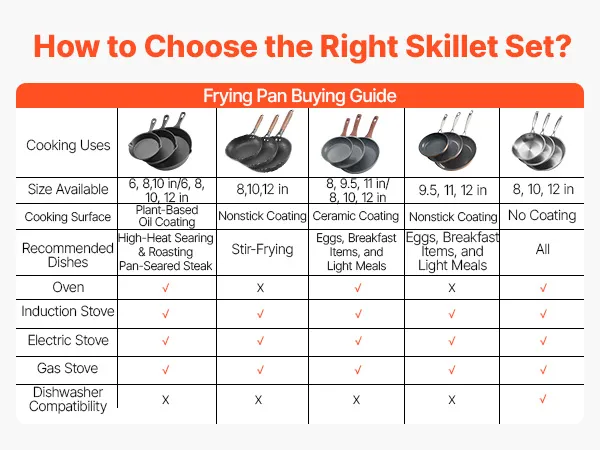 Works with All Cooktops: Suitable for frying, searing, steaming, simmering, baking, and stir-frying. This skillet set is compatible with gas, electric, and induction stoves, and can also be used in the oven for added cooking flexibility