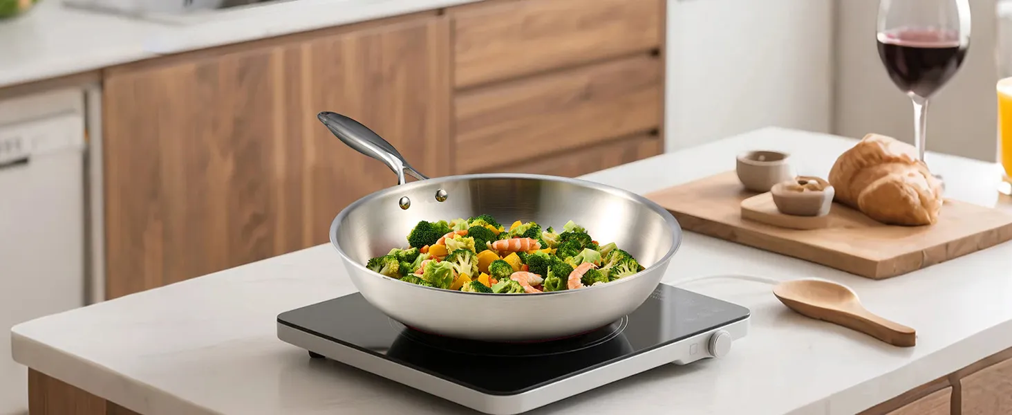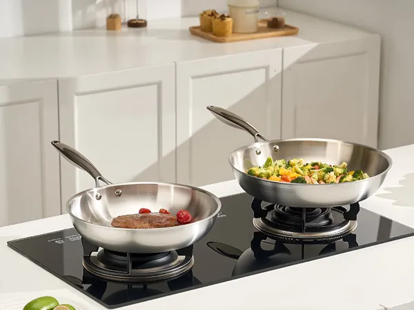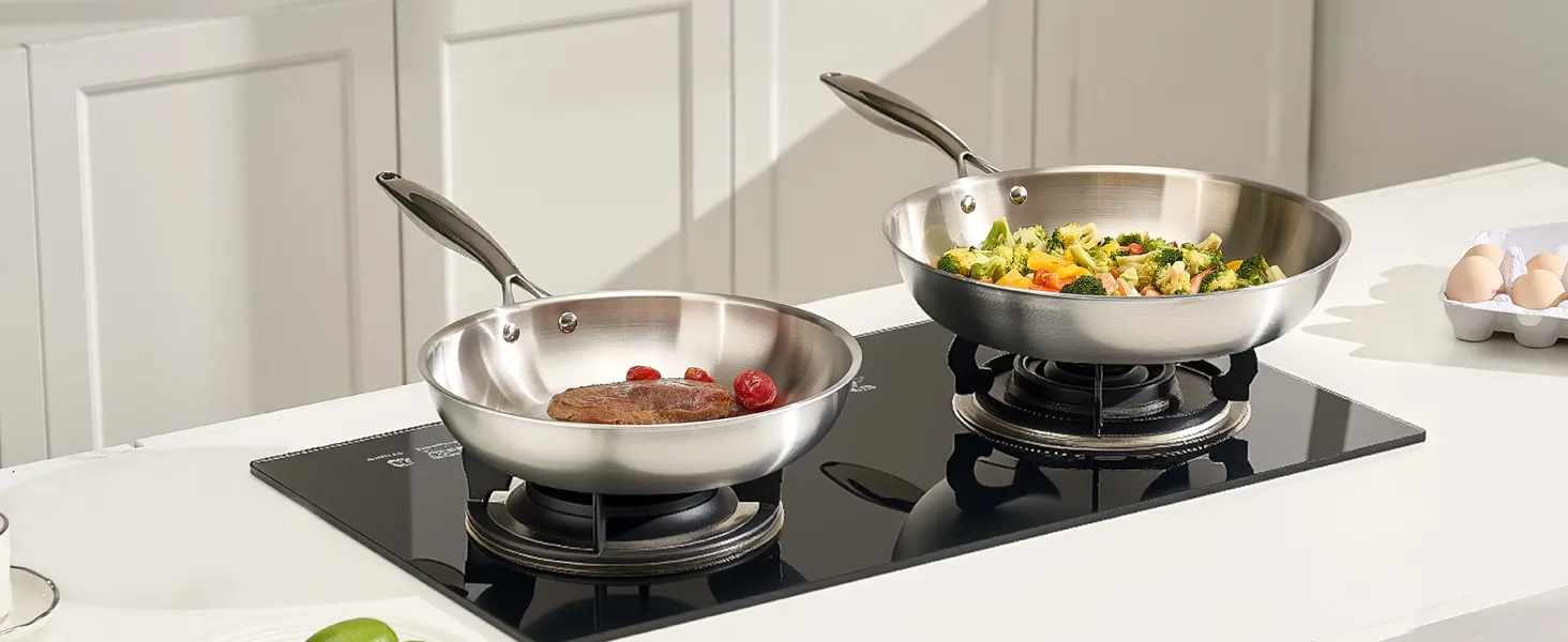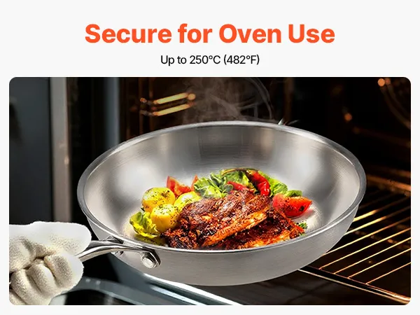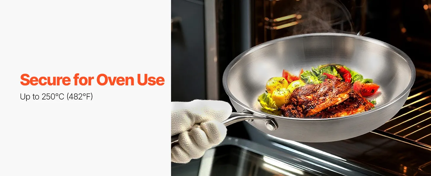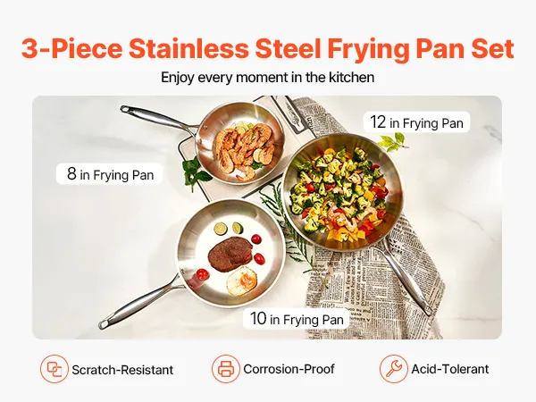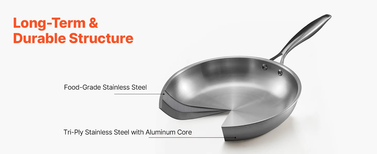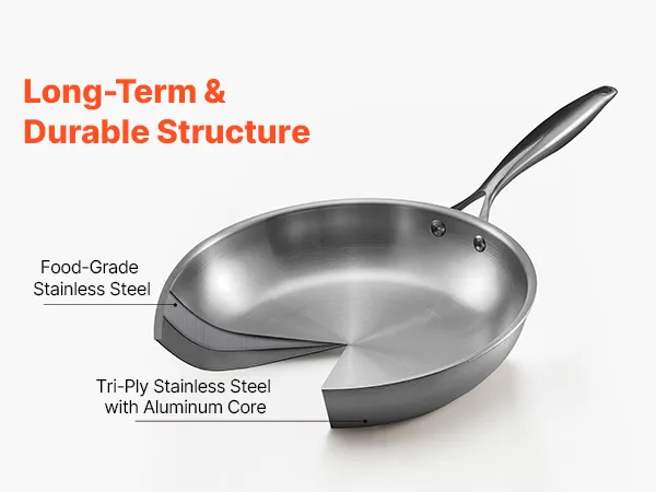 Built to Last: Our frying pan set features a triply-layer stainless steel with polished surface interior and exterior, providing even heat distribution and durability. Its composite stainless steel surface resists scratches and warping for daily use