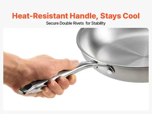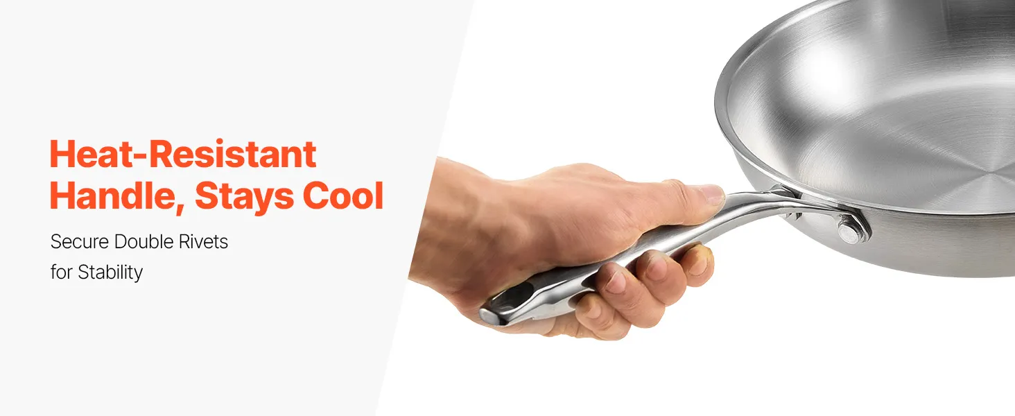 Comfort Grip, Stays Cool: Our stainless steel skillet set is designed with an ergonomic cast steel handle riveted to the pan for lasting durability and comfort. It stays cool on stovetops to help avoid burns, while adding a sleek, modern touch