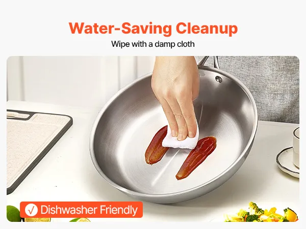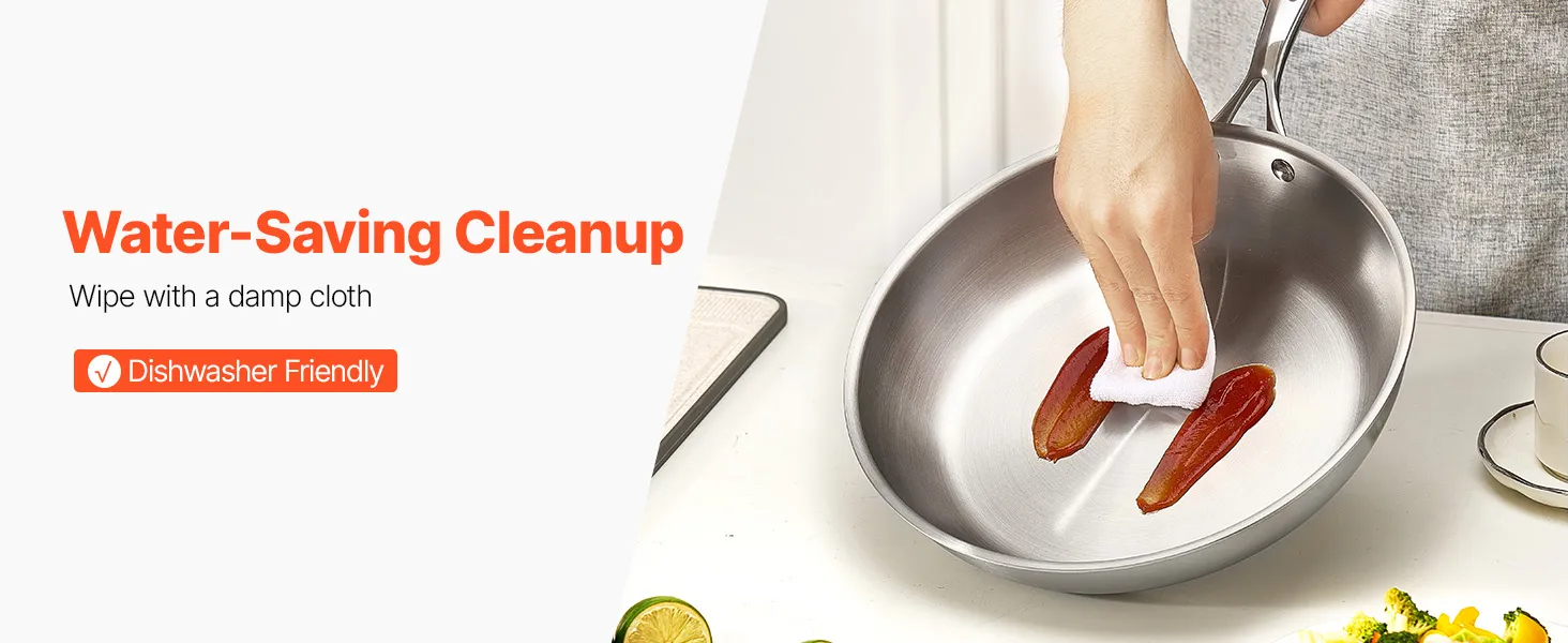 Easy to Maintain: This stainless steel skillet set wipes clean in seconds. Once cool, wash with warm soapy water and a soft sponge. Note: it's dishwasher friendly